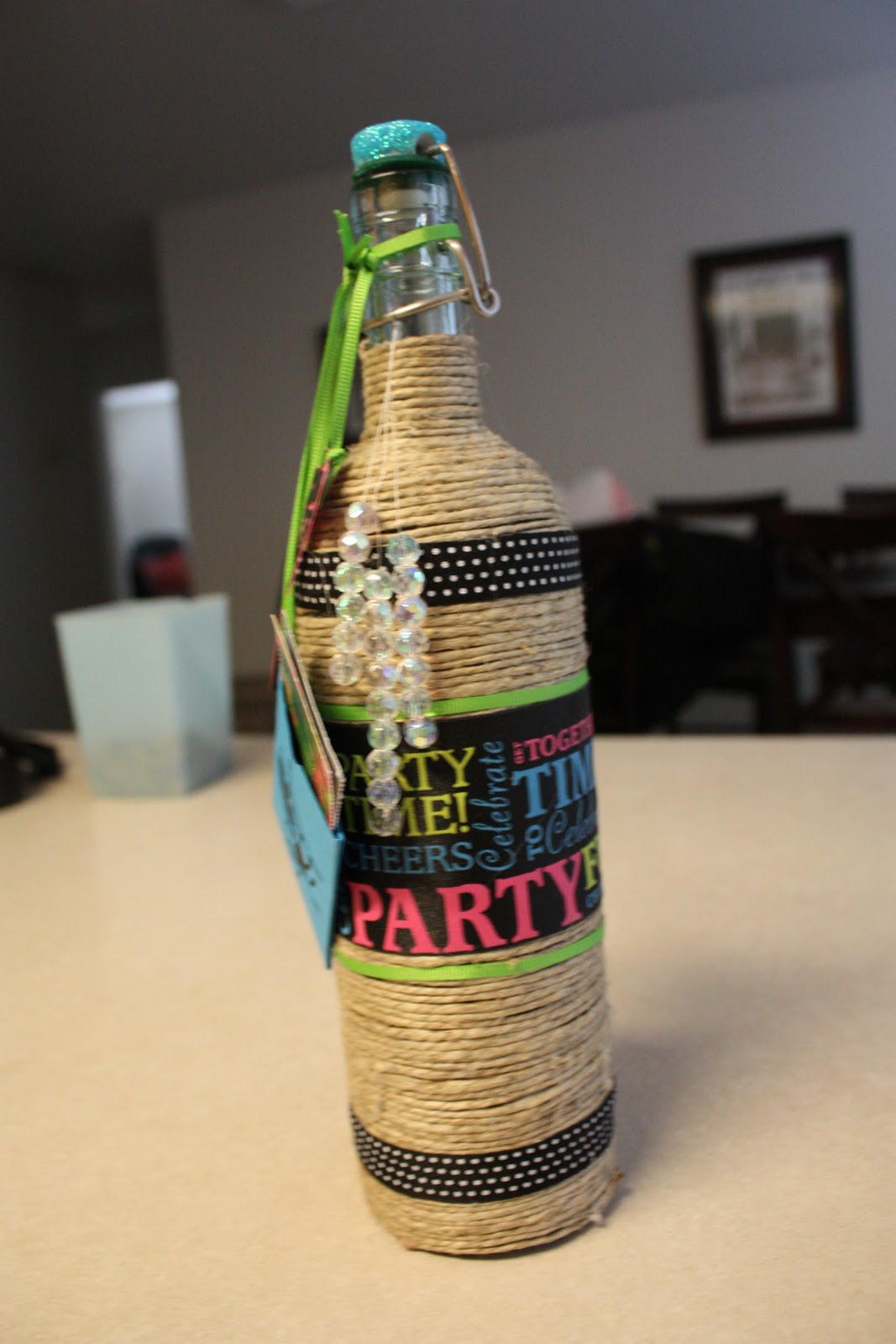 Here is a project that I made last year for a friend. I decorated a wine bottle, and then added a pocket and put lottery tickets in it. I have never shared it, but it is one of my favorites :)